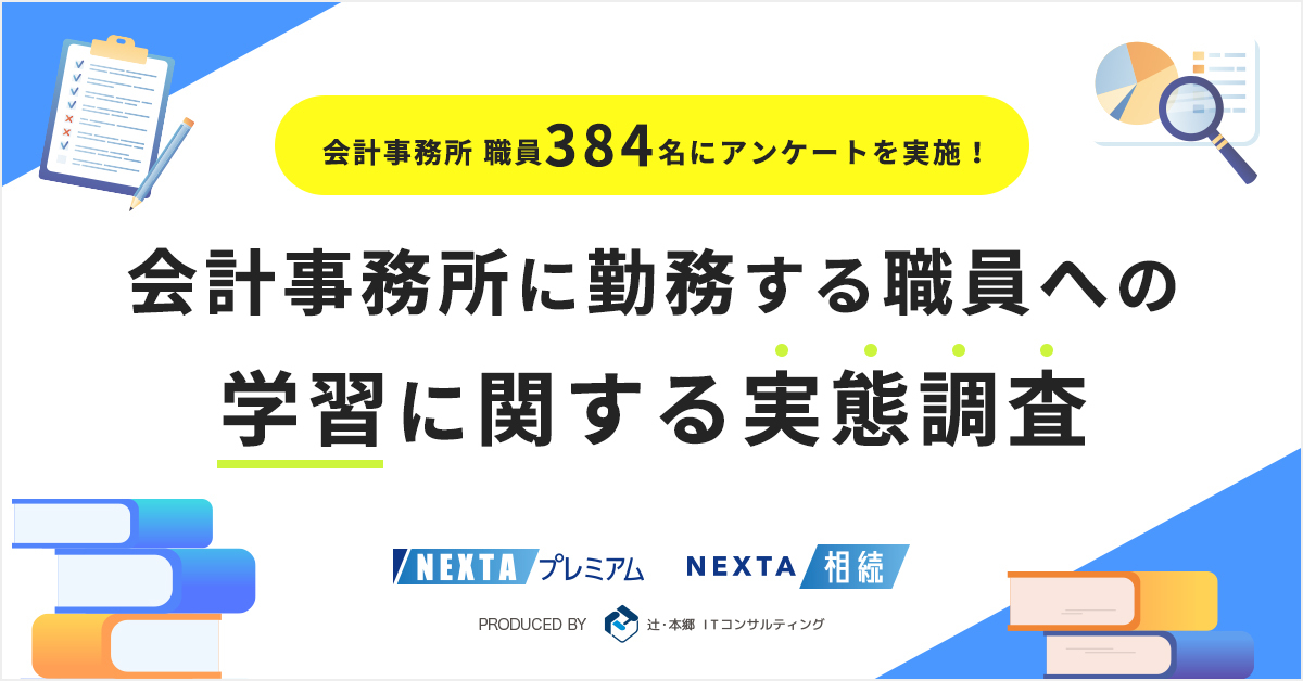 会計事務所の実践的な学びをサポートする教育研修サービス『NEXTAプレミアム』、及び会計事務所の相続業務のクラウド化を実現する『NEXTA相続』を運営する、辻・本郷 ITコンサルティング株式会社(本社:東京都新宿区、代表取締役社長:黒仁田 健)では、サービス会員となる会計事務所の職員に対し、学習に関する調査を実施しましたので、お知らせ致します。