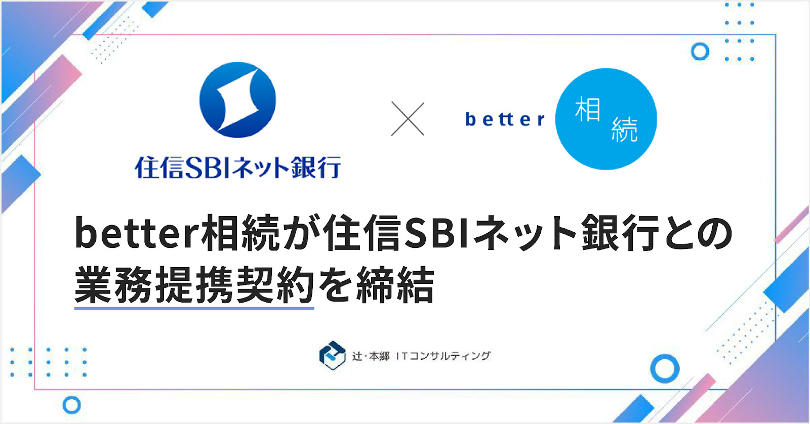 弊社は、住信SBIネット銀行株式会社(本社:東京都港区、代表取締役社長(CEO):円山 法昭、以下「住信SBIネット銀行」)と、業務提携契約を締結したことをお知らせいたします。本締結により、預金等の相続手続きのため住信SBIネット銀行のWEBサイトを訪れた際に「better相続」を相続人に最適な選択肢の一つとして提示することが可能になります。