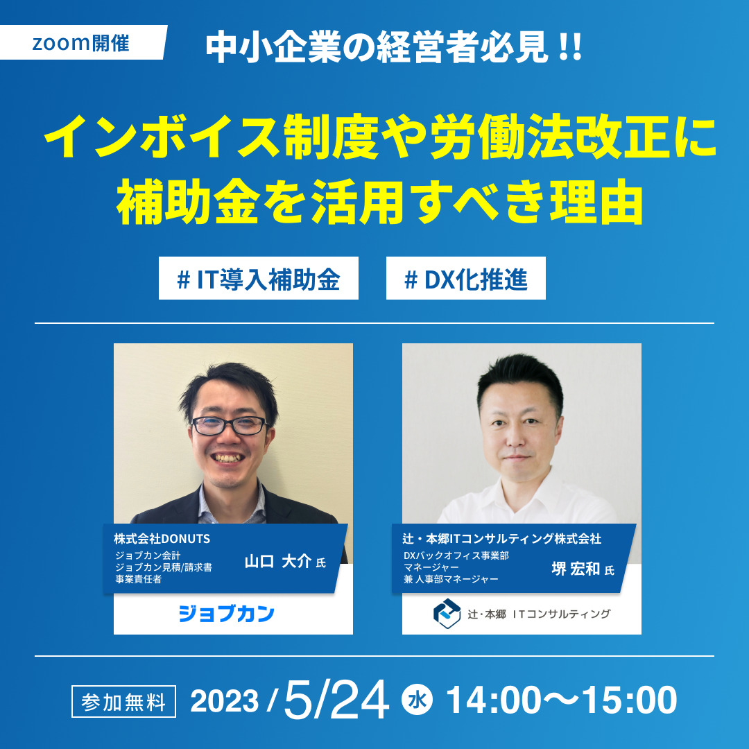 本セミナーでは、「法改正・IT導入補助金・DX」の関係性について詳しく解説致します。 2023年4月1日に施行さた改正労働基準法により月60時間を超える時間外労働の割増賃金率が大企業・中小企業を問わず一律「50%」に引き上げられました。その他にも2023年10月1日より施行されるインボイス制度により対応できない場合は、値下げ交渉やより引き停止のリスクなど企業間の取引に様々な影響がでると言われています。さらに2024年問題では運送ドライバーの時間外労働に年960時間の上限規制が設けられます。 相次ぐ法改正が行われ、企業には大きな負担となる可能性があります。インボイス制度に対応するためにITツールの新規導入コスト、2024年問題に対応するための人材の採用や賃上げ、人が働く時間には限りがるため限られた時間内でいかに効率よく業務が出来るかが問われる時代になっていきます。 業務効率化のためにITツールが期待されていますが、設備投資には費用が発生します。予算の都合上、設備投資が出来ない。社内DXを進めたいがやり方が分からない。そんなお悩みをお持ちの方に設備投資に役立つIT導入補助金やDXの導入事例を詳しくご案内いたします。是非、ご参加ください!! ■IT導入補助金とは? 生産性向上に取り組む中小企業・小規模事業者等を支援する国の制度。IT導入補助金2022から継続された「デジタル化基盤導入枠」では会計ソフト・受発注ソフト・決済ソフト・ECソフトなどのITツールが対象となっており、インボイス制度への対応も見据えつつ企業間取引のデジタル化を強力に推進するため、「通常枠」よりも補助率を上げて優先的に支援されます。 ITツールの導入費用の一部を補助するだけではなく、PCやタブレットも補助対象となっているのが大きな特徴です。インボイス制度への対応や業務の効率化などをお考えの方には「デジタル化基盤導入枠」を是非、ご活用ください。