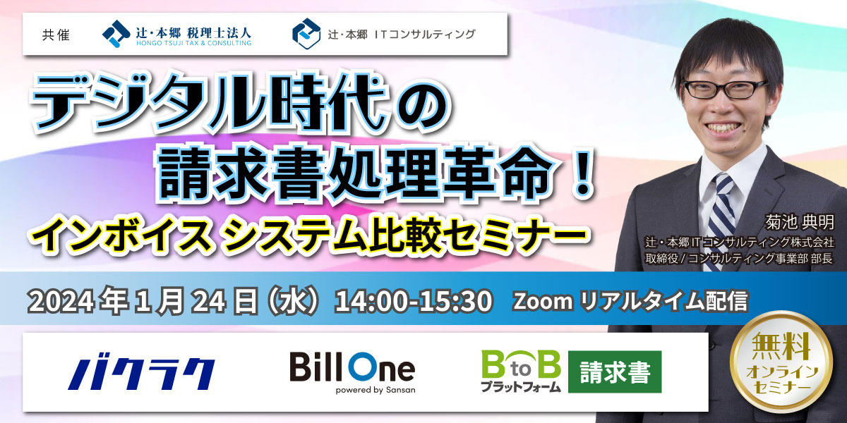 辻・本郷ITコンサルティング株式会社(本社:東京都渋谷区、代表取締役社長:黒仁田 健)は、辻・本郷 税理士法人(本社:東京都新宿区、理事長:徳田 孝司)と、2024年1月24日(水)に無料セミナー「デジタル時代の請求書処理革命!インボイス システム比較セミナー」を共催します。