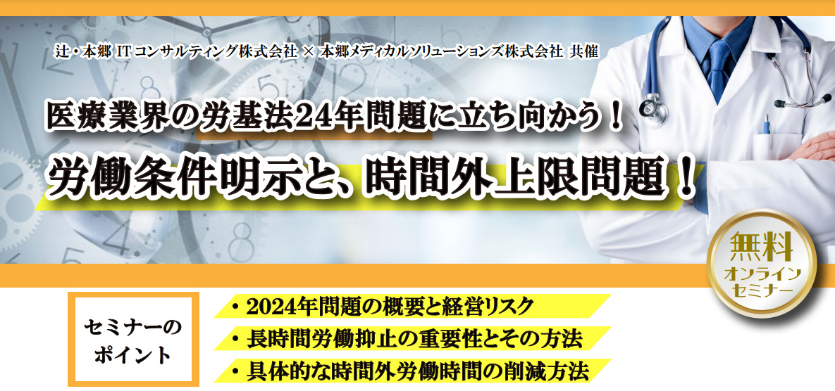 医療業界における重要なテーマになっている、「2024年問題」に立ち向かうため、労基法改正のおさらいや、それにともなう医療法人の経営リスクや、課題に関するセミナーを開催いたします。